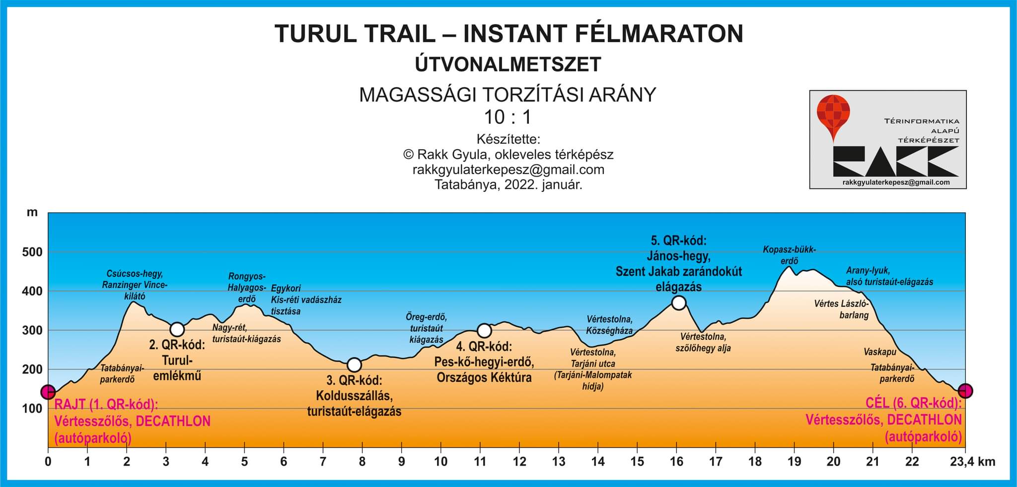 A kilátótól enyhén balra vezet egy vadregényes erdei ösvény, amit végig egyenesen követve egy tisztásra érünk, közepén tájfutó berkekben jellegfának tökéletesen megfelelő gyönyörű girbegurba fa. A tisztáson áthaladva a salakos úton jobbra, majd a tanösvényre érve balra tartva hamarosan meglátjuk a Turul madarat egy szűk ösvényt választva jobbra. Az ösvényről kiérve pont szemben találjuk magunkat a szoborral. Szelfizés után a Gerecse kapuja mögötti salakos ösvényen végigsétálva jobbra vesszük az irányt, a P jelzést követve. Ahol a P útvonala kiér egy műútra, ott kell keresni jobb oldalon a P+ jelzést. Ha megtaláltuk, akkor a jobbos után rögtön forduljunk balra, mint ahogyan az a térképen is látszik.